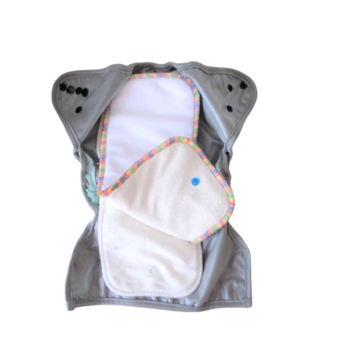 - l'insert se pose ou se pressionne dans la culotte (pressions à l'avant et à l'arrière) donc il ne bouge pas pendant le change ce qui en fait un modèle très pratique, surtout pour les maladroits ;) C'est un modèle apprécié par les crèches!